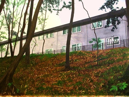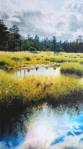 ●左の風景画は写実的に描いてあります。(北海道に行ったときの根室の湿地の風景)