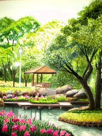 50 水郷公園で、石と木々の陰影の表現が素晴らしいです。芝生の木陰でお茶したい気分になります。
