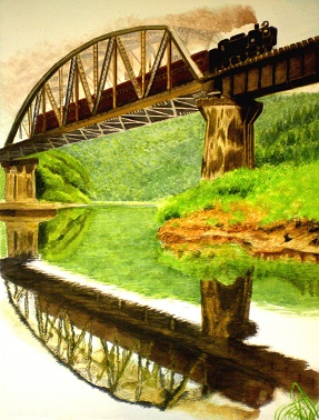 60 SLと鉄橋良く描かれています。煙の描き方苦労されましたが、煙の淡い質感バッチリです。湖面に映った表現も苦労されました。(^-^)