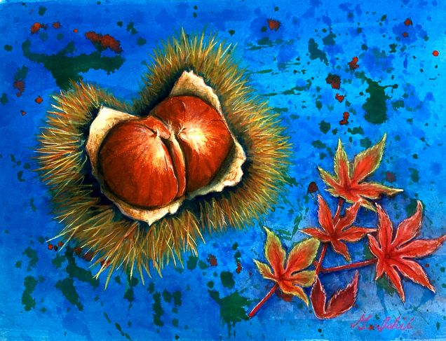 71 栗の立体感と皮の光沢よく表現されています。バックのブルーも主体を浮き出させています。もみじの赤はワンポイントになっていていいですねー。